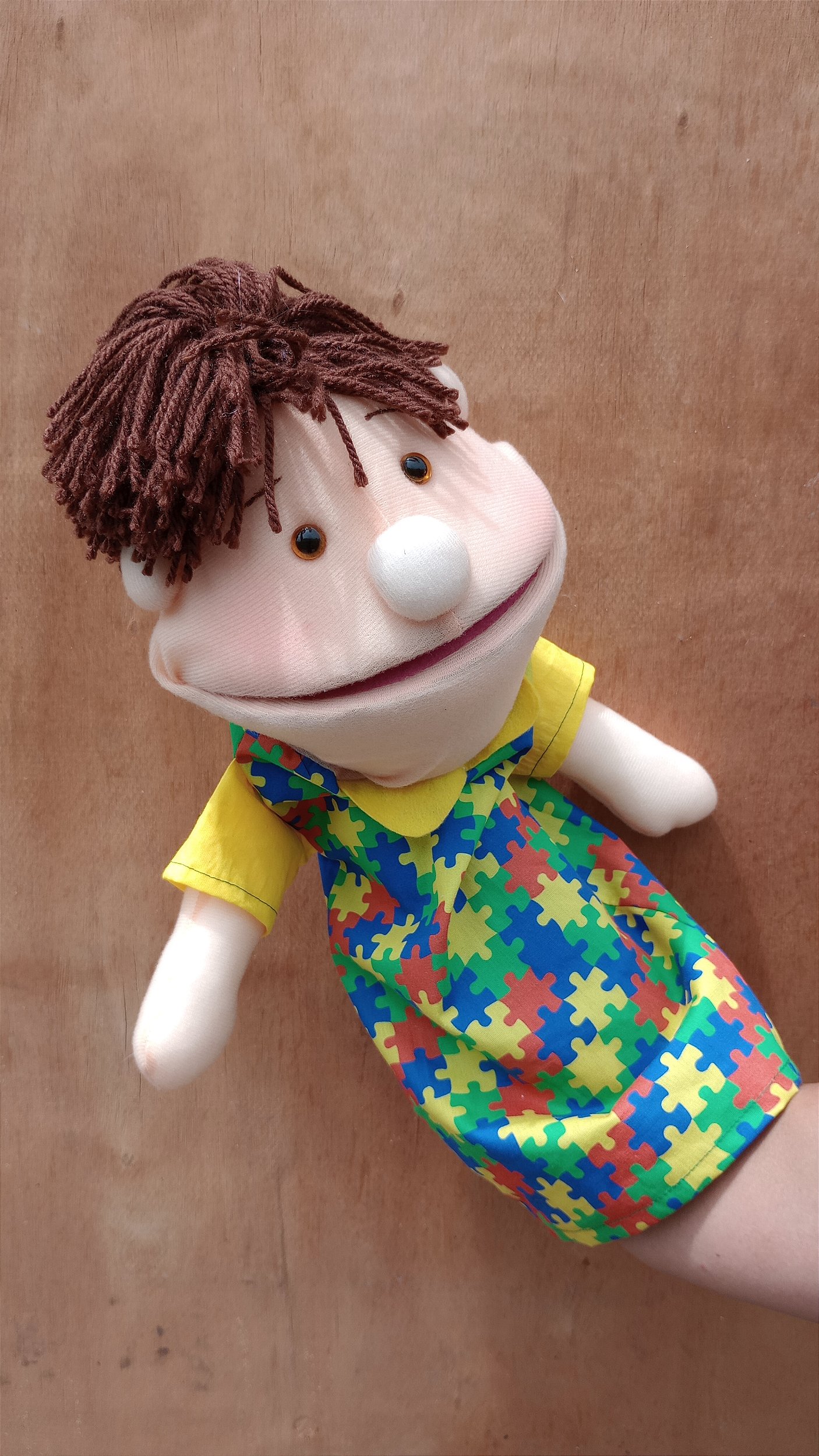 Este fantoche Nino Autismo é ideal para estimular a comunicação e o desenvolvimento de crianças com autismo. Produzido com tecido macio e cores vibrantes, o brinquedo expressa sensibilidade e conexão, tornando a interação lúdica mais acessível. Seu design artesanal inclui detalhes delicados como olhos e cabelo em lã que proporcionam toque agradável e segurança. Fácil de manusear, o fantoche de tamanho adequado incentiva habilidades motoras finas e promove o uso da imaginação em atividades educativas e terapêuticas.