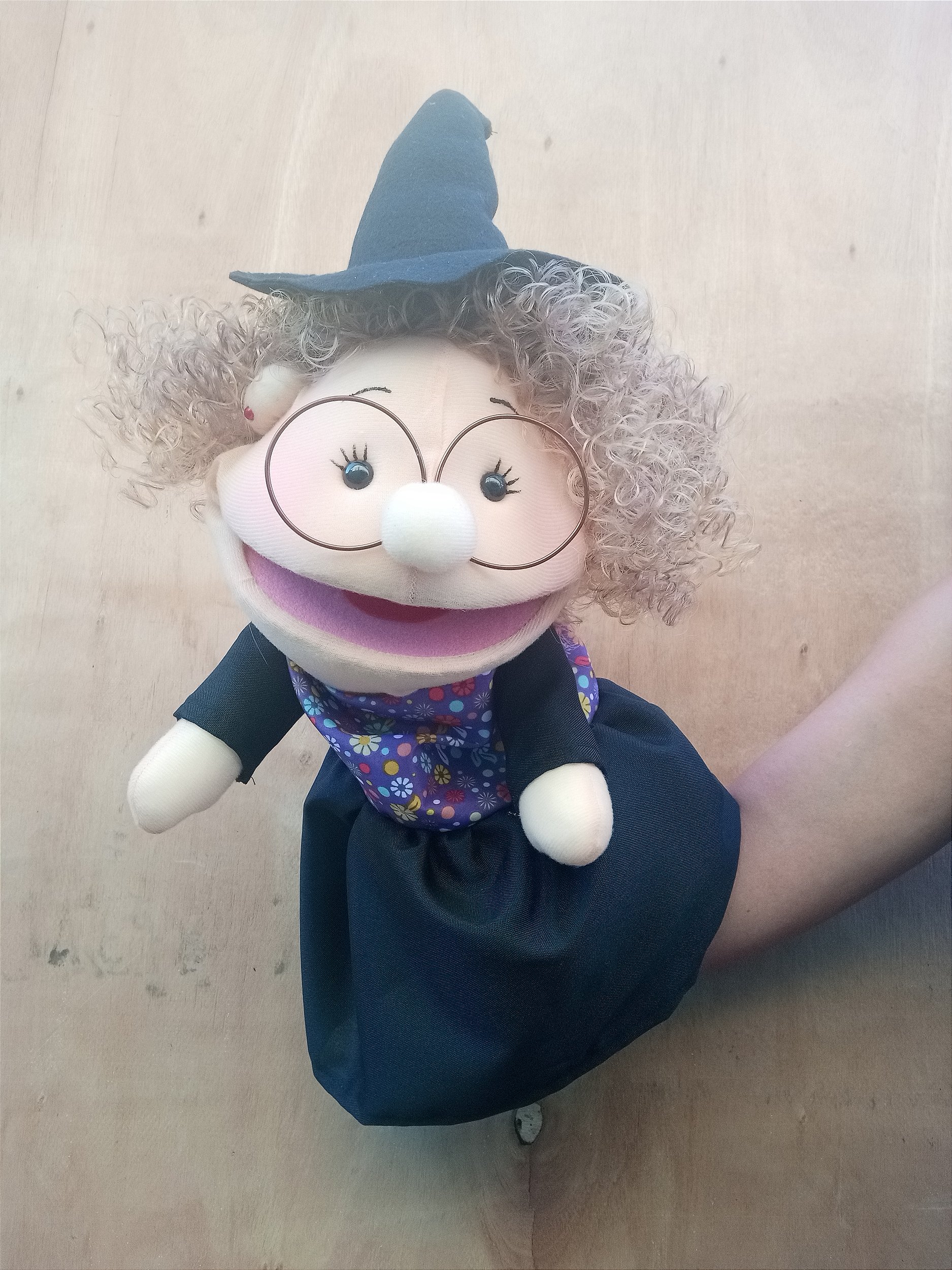 Fantoche confeccionado em tecido com acabamento caprichado para simular uma pequena bruxa com óculos redondos dourados e cabelo encaracolado em tom claro. A peça tem saia preta e parte superior preta, com detalhes roxos estampados no corpo. Ótima ferramenta para estimular brincadeiras, contação de histórias e o desenvolvimento da imaginação infantil.